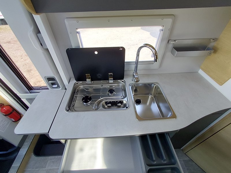 8-Gang Automatikgetriebe, Radio 9'' (AppleCarPlay und AndroidAuto), Lenkradsteuerung, Plisse-Rollos Fahrerhaus, Polsterung "Elba", Spülbeckenabdeckung, Duocontrol, Aufbauteppich,