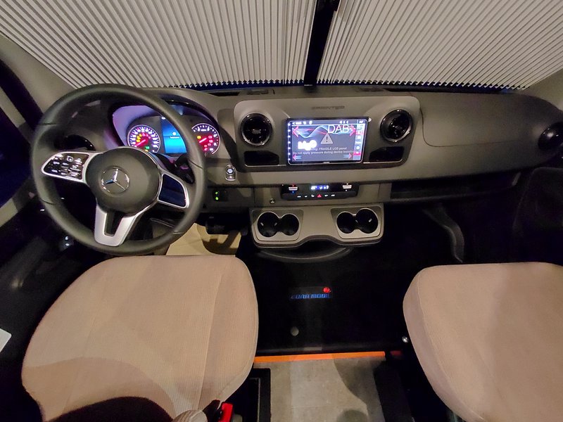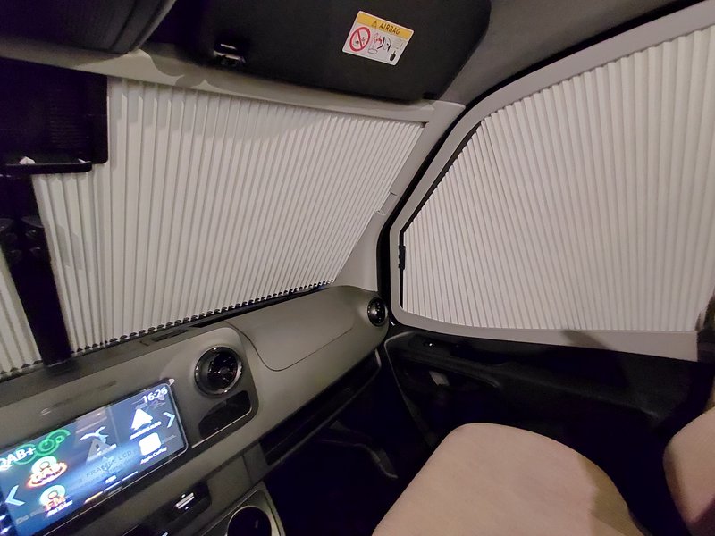 (Elektrische Außenspiegel (MB), Captain-Chair-Sitze (Aguti), Moniceiver (Xzent) mit Rückfahrkamera, elektrische Feststellbremse, Klimaanlage Fahrerhaus, Tempomat, Wärmedämmendes Glas mit Bandfilter, Lackierung Uni Schwarz, Aufbautür mit 2-Punktverriegelung + Zentralverriegelung, Dach - Panorama aufstellbares Kunststoffdach Sun Roof, Elektrischer Dachlüfter, Dachhaube Heki, manuelles Verdunkelungs-System für Fahrerhaus, Mückengittertür, Vorverkabelung für Solaranlage) Lackierung Uni-Schwarz MB Verdunklungs-System Fahrerhaus Panoramadachfenster "Sun Roof" , isoliert und aufstellbar Elektrischer Dachlüfter Hebekipp-Dachhaube (Heki) Mückengitter für Aufbautür Vorverkabelung für Solaranlage